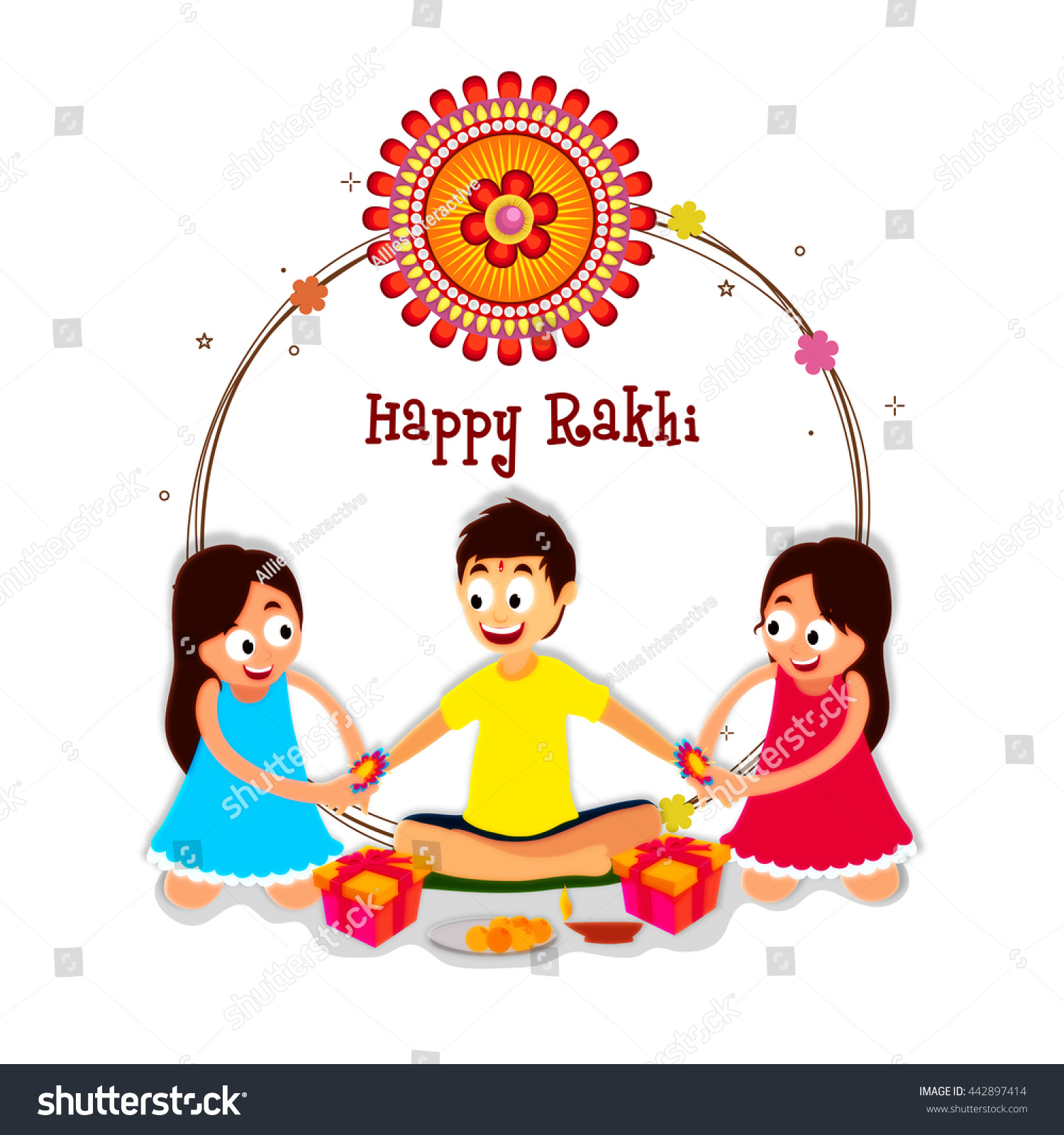 Happy Rakhi Celebration Concept with Doodle Style Illustration of Cute Girl Tying Rakhi to Her Brother on Abstract Splatter Background. Pro Vector